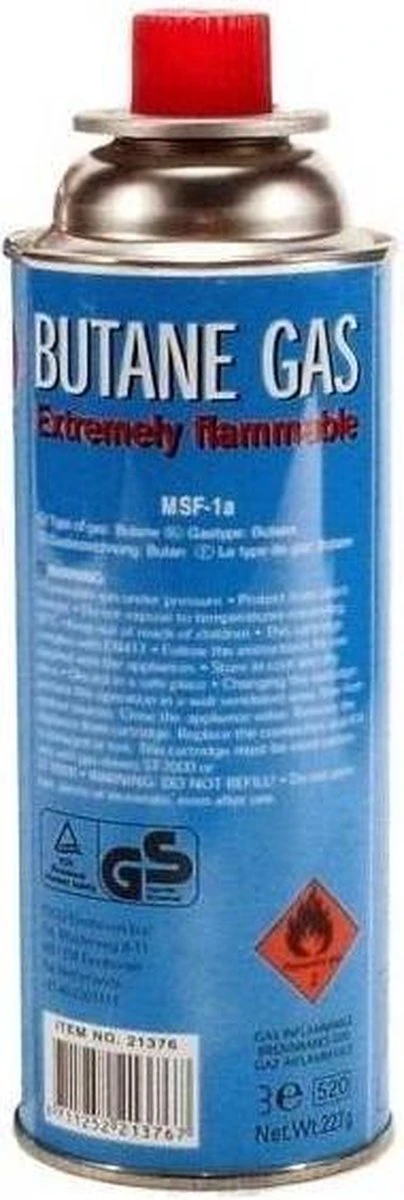 Gasbus van het merk All-ride gevuld met butaan. Wegwerp fles, niet geschikt voor navullen. Standaard aansluiting welke past op kooktoestellen en onkruidbranders
